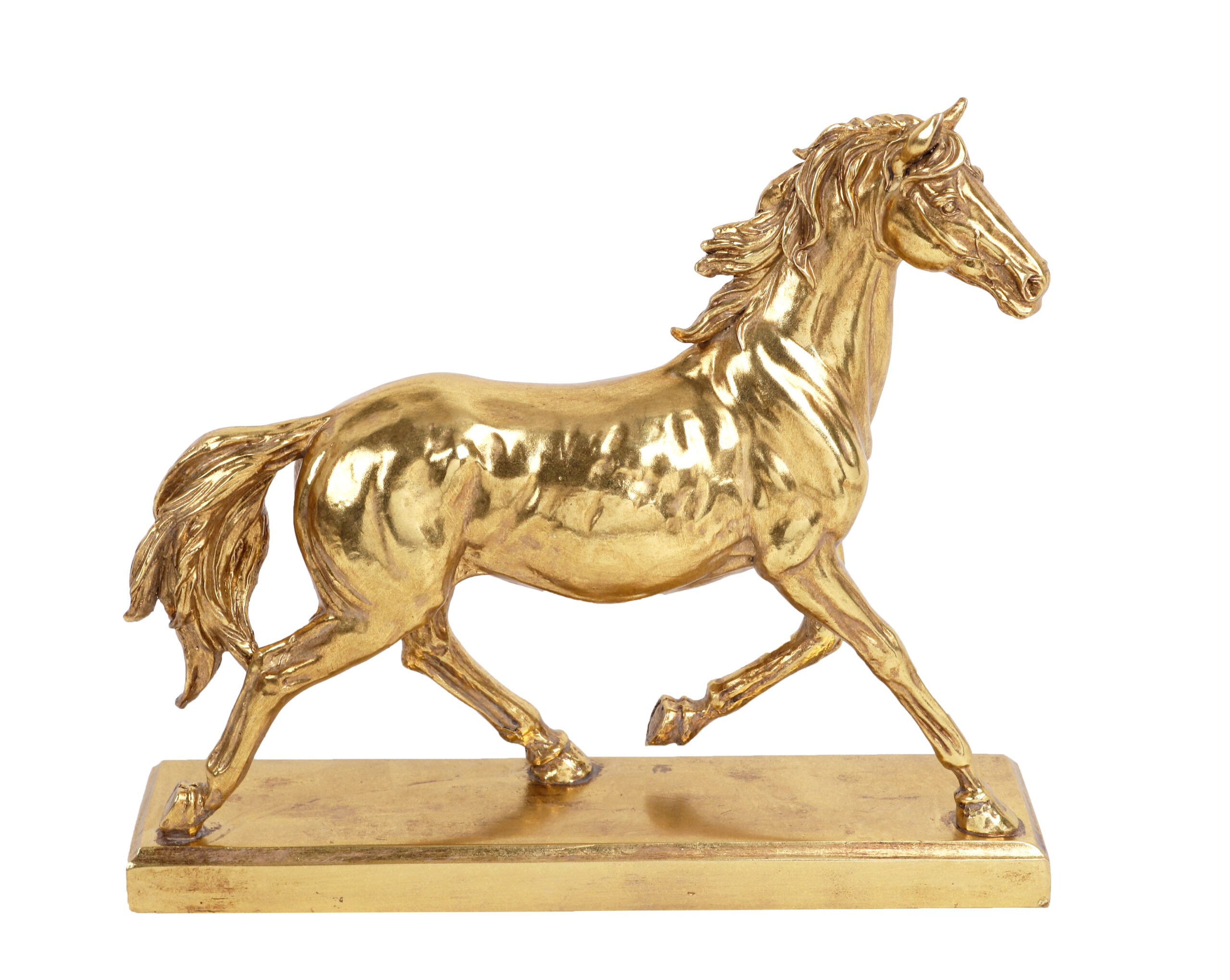 A Estatueta Cavalo é uma peça decorativa de grande presença, que simboliza força, liberdade e sucesso. Produzida em resina com acabamento dourado, possui design alongado e elegante, tornando-se um destaque na composição de ambientes sofisticados.
