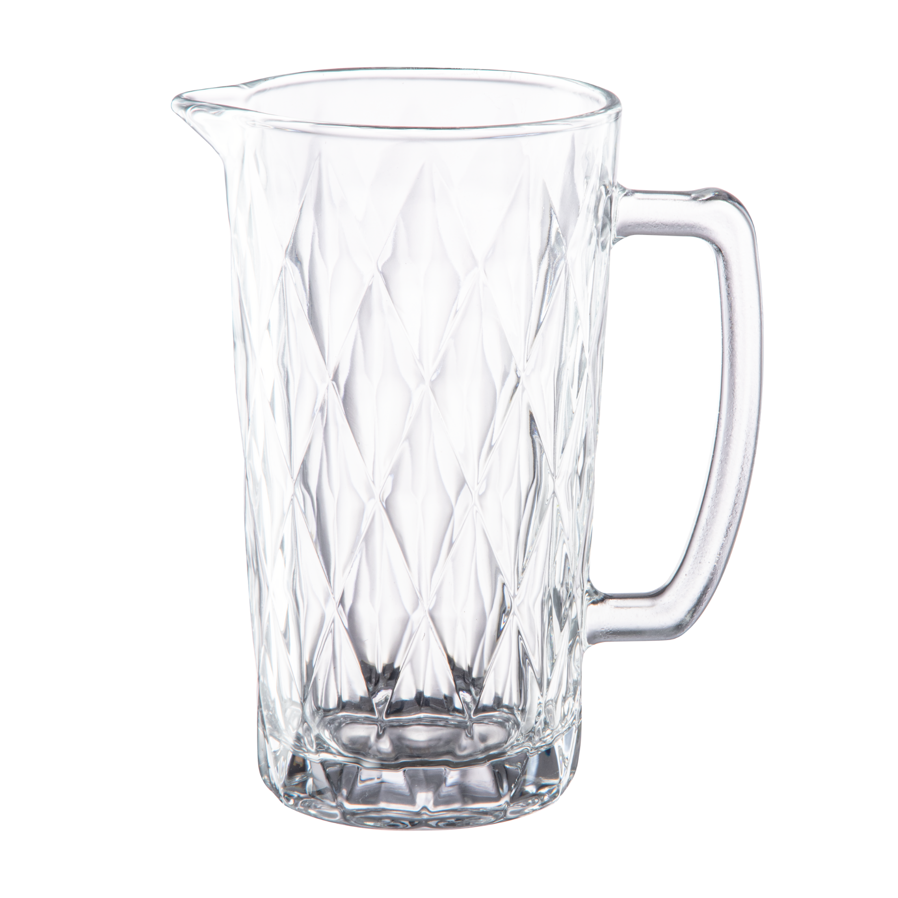 Jarra de vidro Diamond 1,1L com design facetado elegante. Ideal para servir bebidas com estilo em almoços, jantares e recepções.
