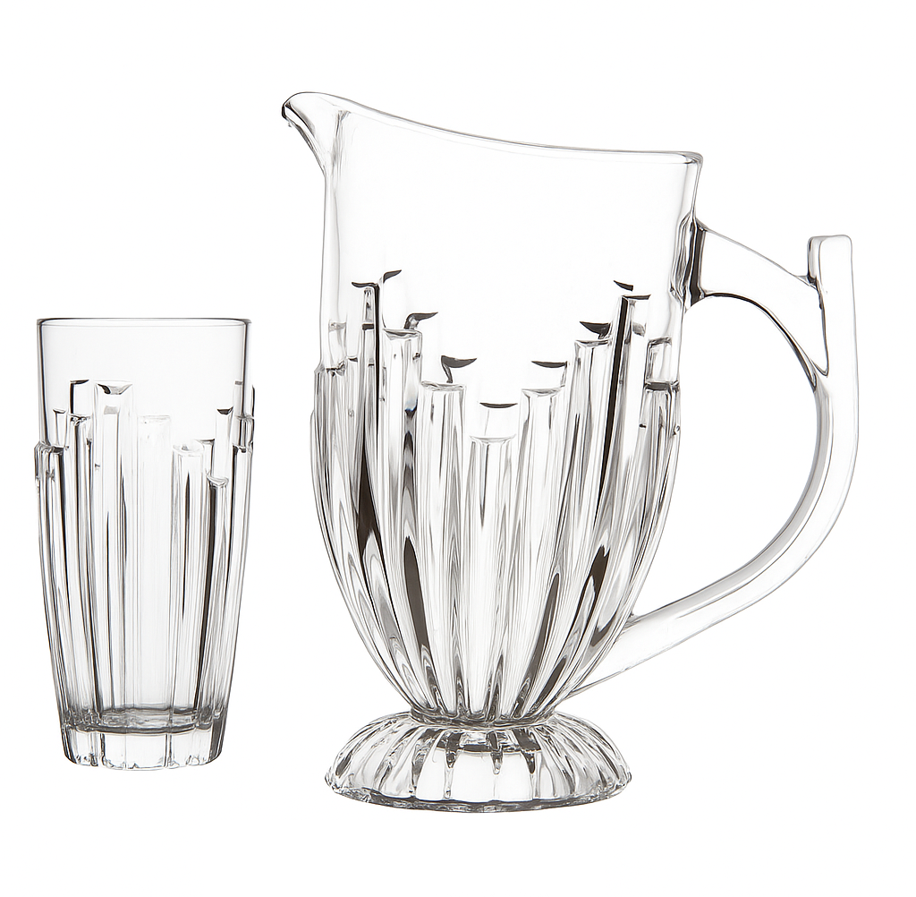Conjunto de Jarra com 6 Copos Altos em vidro transparente. A jarra possui capacidade de 1,25L e medidas de ø13,5xh22,5cm, acompanhada de copos de 370ml cada, com ø7xh14,5cm. Ideal para servir bebidas com elegância em qualquer ocasião.