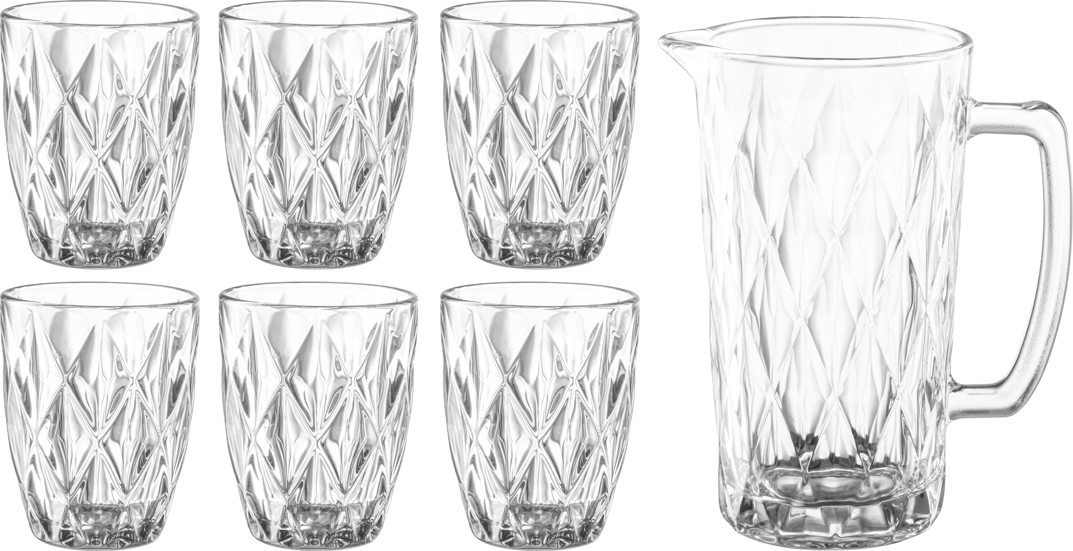 Jogo com 1 jarra + 6 copos baixos. Ideal para servir bebidas com praticidade e elegância no dia a dia ou em ocasiões especiais.