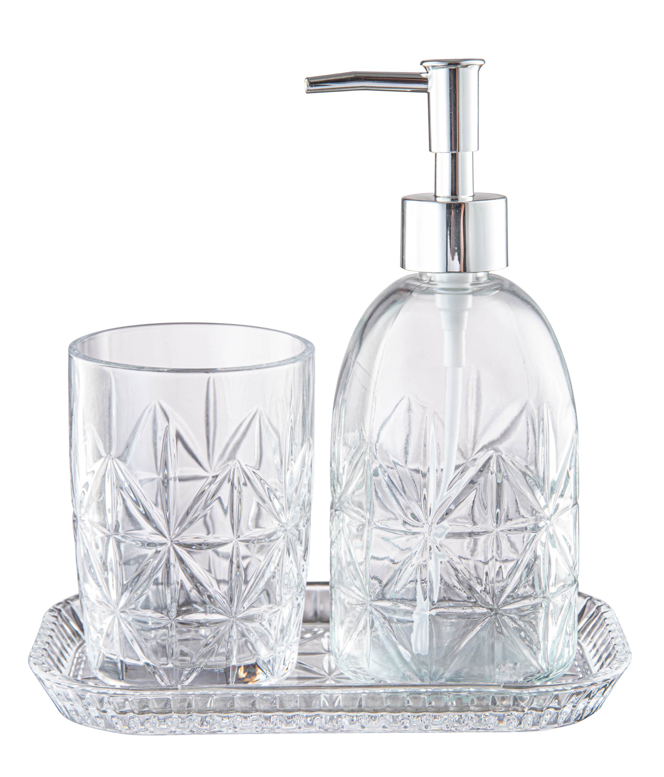 Perfeito para acomodar itens essenciais do dia a dia, como sabonete líquido, algodão ou acessórios, o conjunto traz praticidade sem abrir mão do charme.